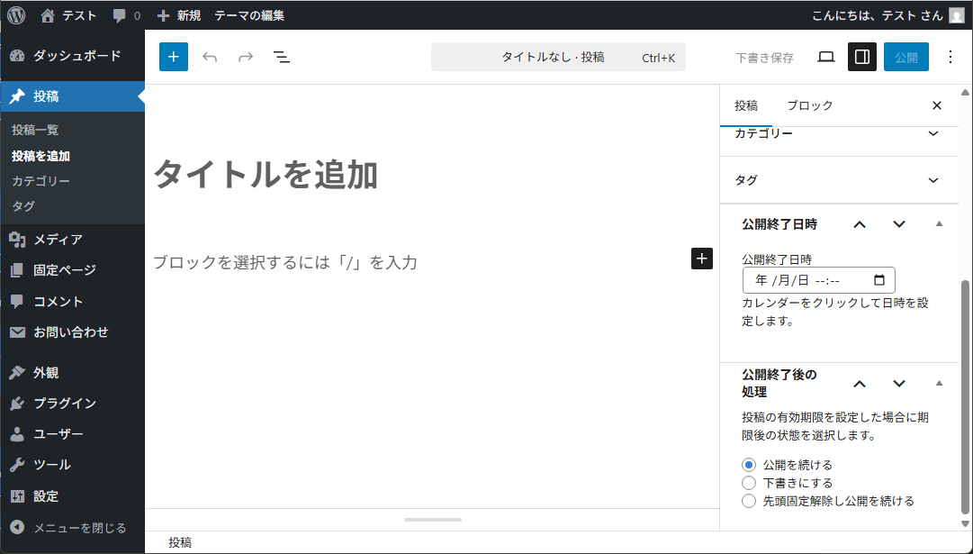 公開終了日時を指定して下書きにするかを選択できるようにします。